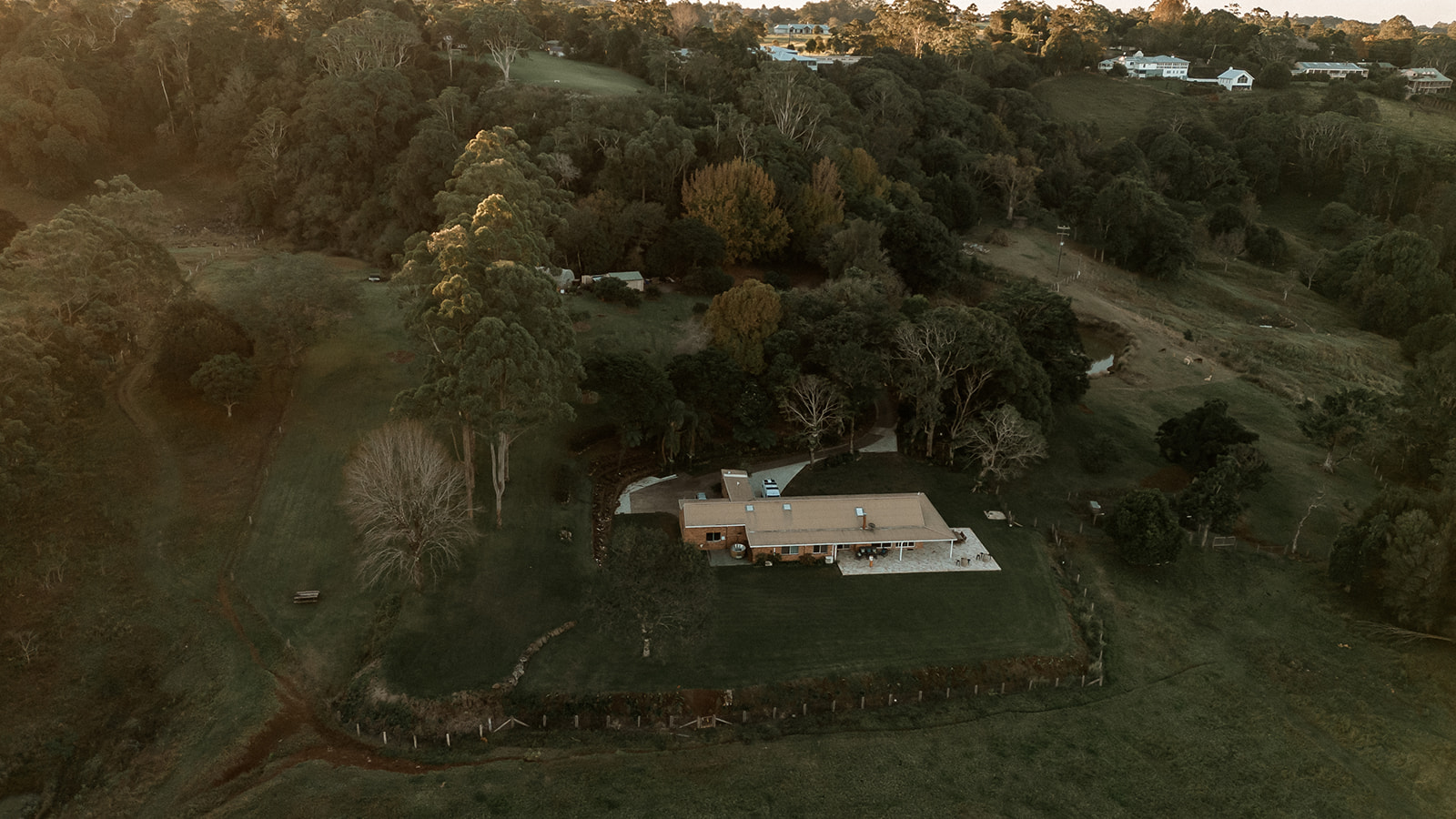Our property is accessed via a 450 metre private driveway that winds through rainforest, past the orchard and lake, before opening up to